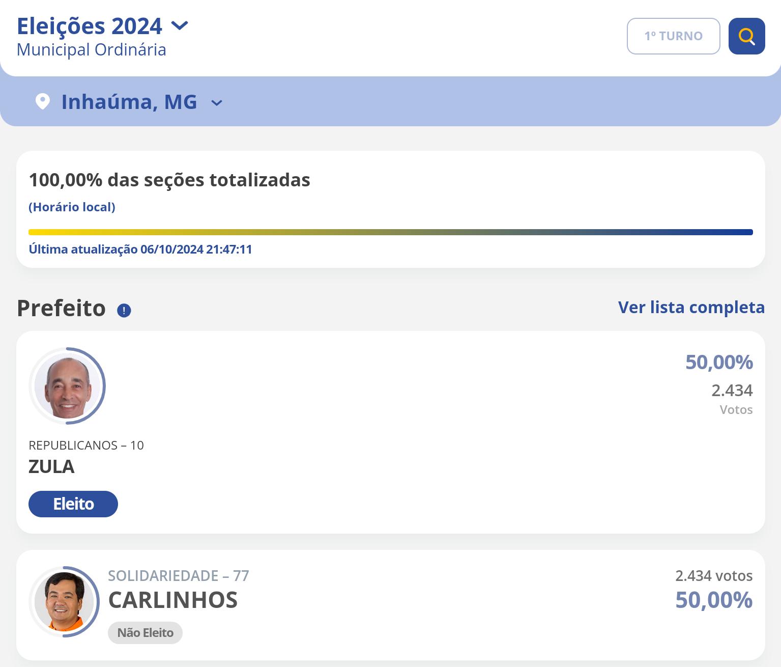 A cidade de Inhaúma tem 6.239 habitantes e, por esse motivo, não existe a possibilidade de um segundo turno. Apenas cidades com mais de 200 mil habitantes têm a possibilidade de uma segunda fase eleitoral.