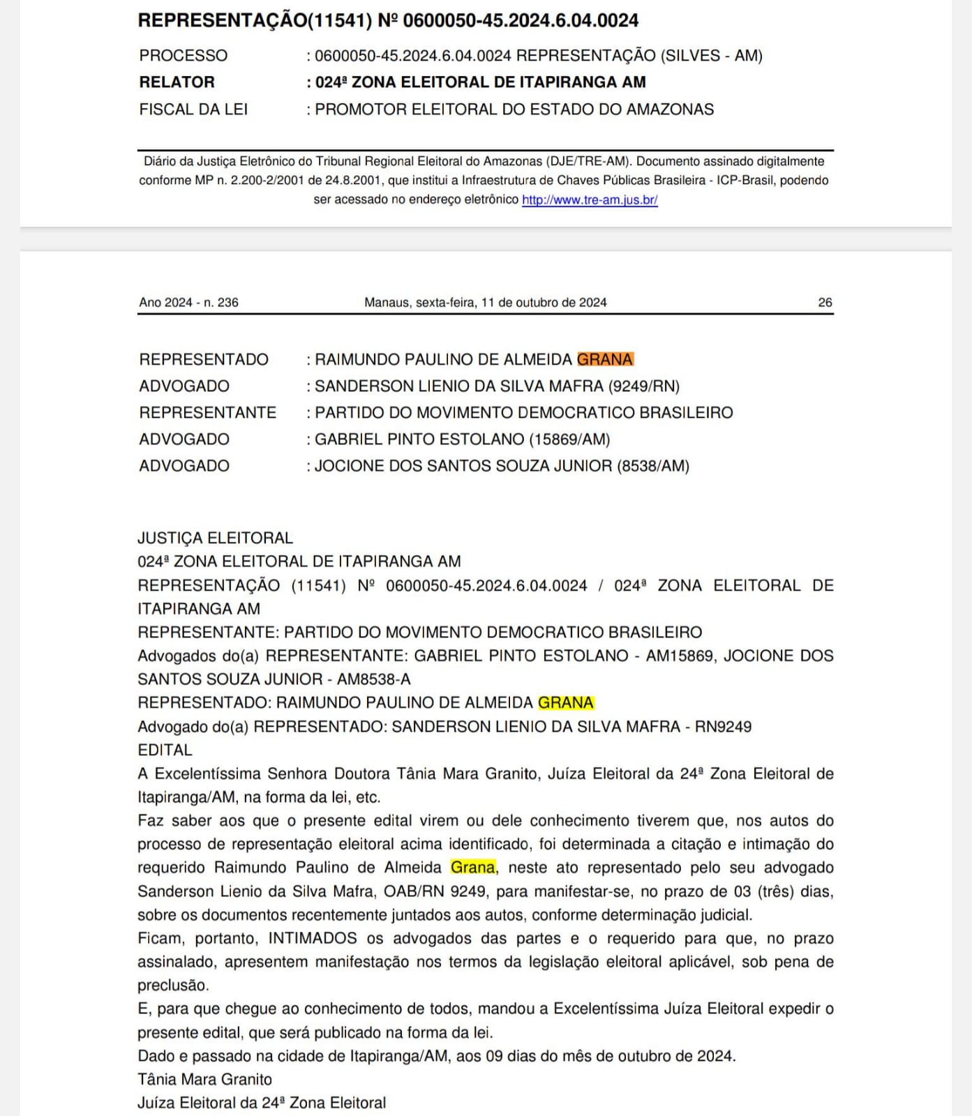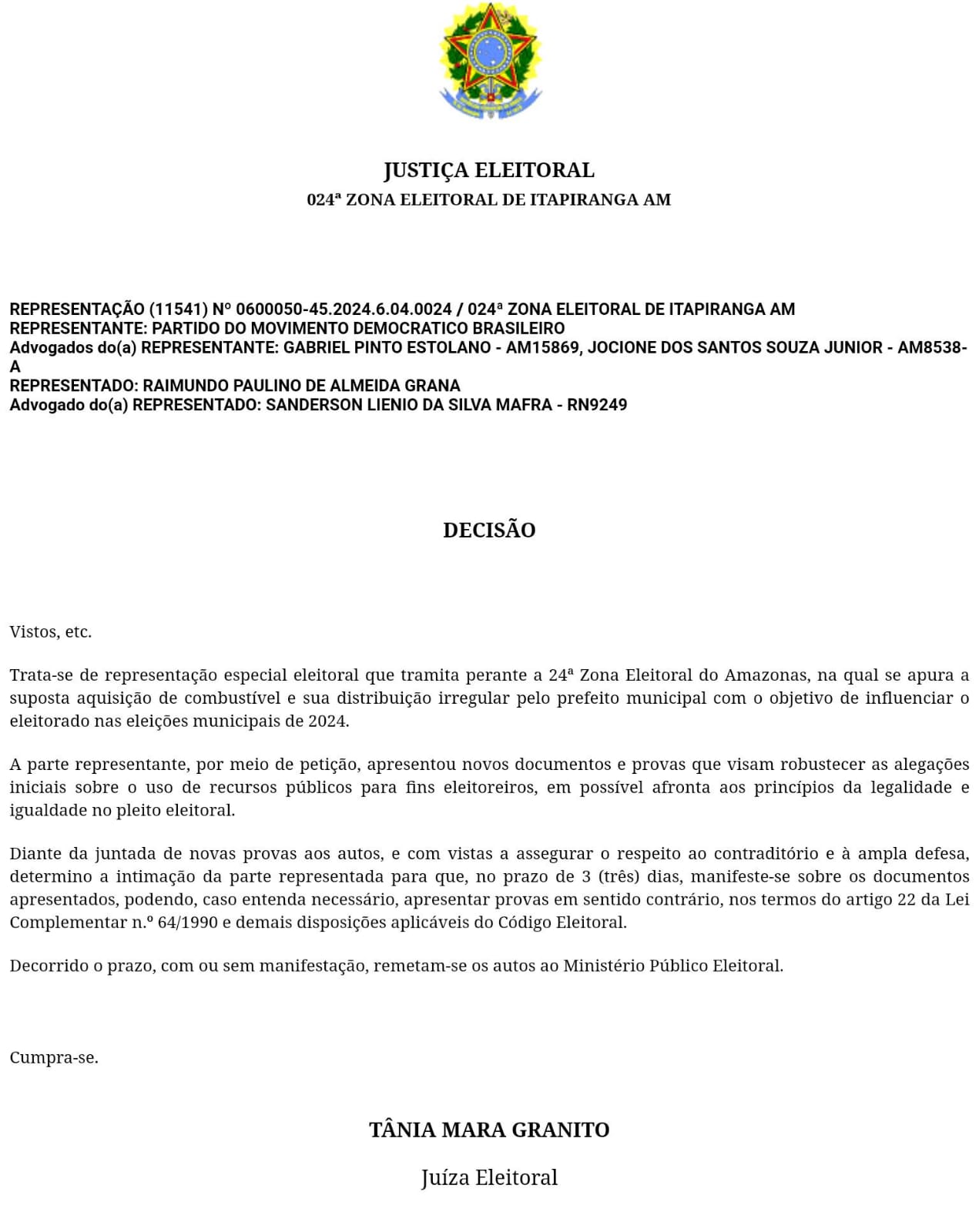 A Justiça Eleitoral, por meio da juíza Tânia Mara Granito, intimou Raimundo Paulino de Almeida Grana, prefeito de Silves, por compra e distribuição irregular de combustível de forma gratuita. O pedido foi feito na 24ª Zona Eleitoral de Itapiranga.