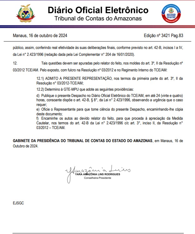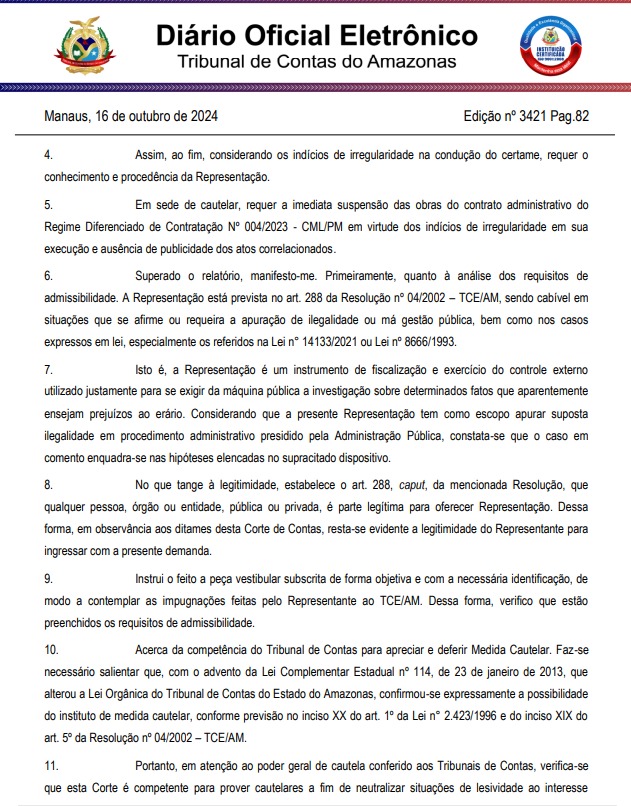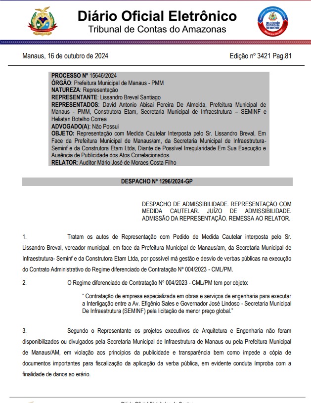 O Tribunal de Contas do Amazonas (TCE-AM) divulgou, por meio do Diário Oficial Eletrônico na última quarta-feira, 16, o despacho do pedido feito pelo vereador municipal, Lissandro Breval (PP), contra a Prefeitura de Manaus, a Secretaria Municipal de Infraestrutura (Seminf) e a Construtora Etam Ltda por suspeita de má gestão e desvio de verbas públicas.