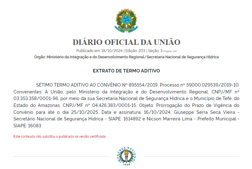 O sétimo termo aditivo foi autorizado pelo Secretário Nacional de Segurança Hídrica, Giuseppe Serra Seca Vieira, e pelo prefeito de Tefé, Nicson Marreira Lima.