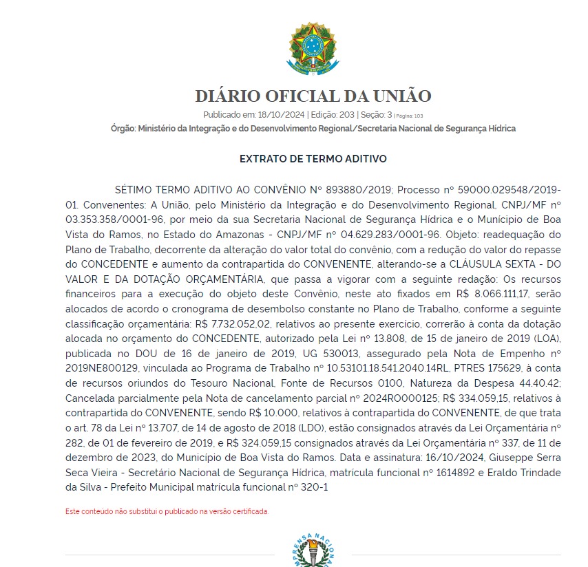 O sétimo termo foi autorizado pelo Secretário Nacional de Segurança Hídrica, Giuseppe Serra Seca Vieira, e pelo prefeito de Boa Vista do Ramos, Eraldo Trindade da Silva.