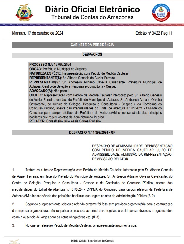 O Tribunal de Contas do Estado do Amazonas (TCE-AM), por meio do Diário Oficial Eletrônico, publicado na última quinta-feira, 17, investiga supostas irregularidades em um Edital de Abertura nº 001/2024, lançado pela prefeitura de Autazes, junto com o Centro de Seleção, Pesquisa e Consultoria (Cespec) e a Comissão do Concurso Público.