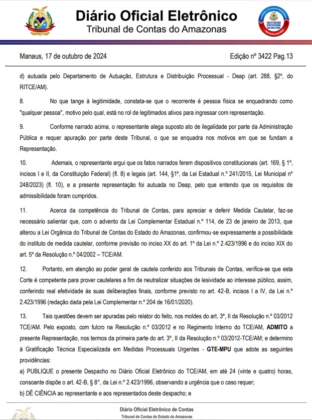 O TCE-AM apreciou e deferiu o pedido de medida cautelar, salientando que a finalidade é neutralizar situações de lesividade ao interesse público. O documento foi assinado pela conselheira-presidente Yara Amazônia Lins Rodrigues.