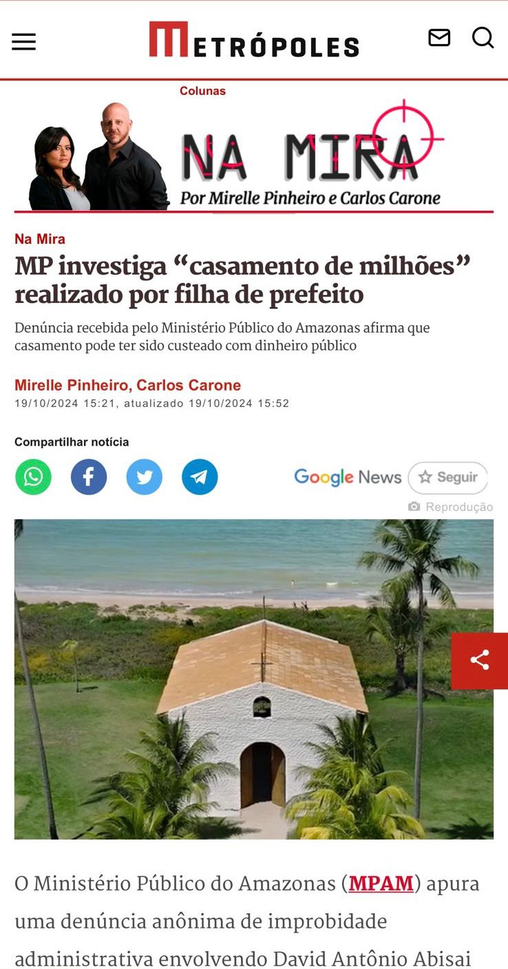 Na noite de sábado, 19, o prefeito de Manaus, David Almeida (Avante), publicou um vídeo por meio das suas redes sociais desmentindo a matéria veiculada pelo Metrópoles que relatava uma denúncia de desvio de recursos públicos para realização do casamento da filha Fernanda Aryel Rodrigues de Almeida, no ano de 2022.