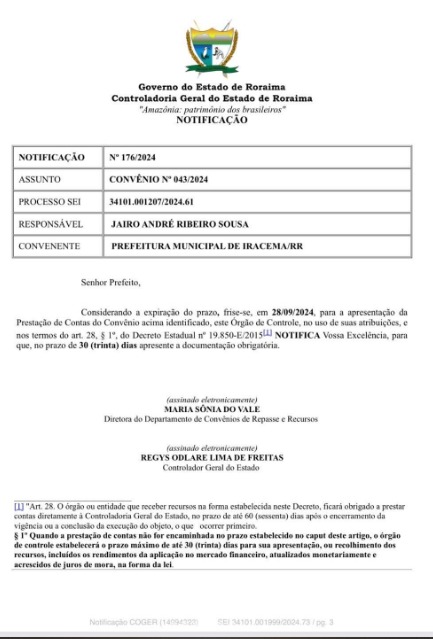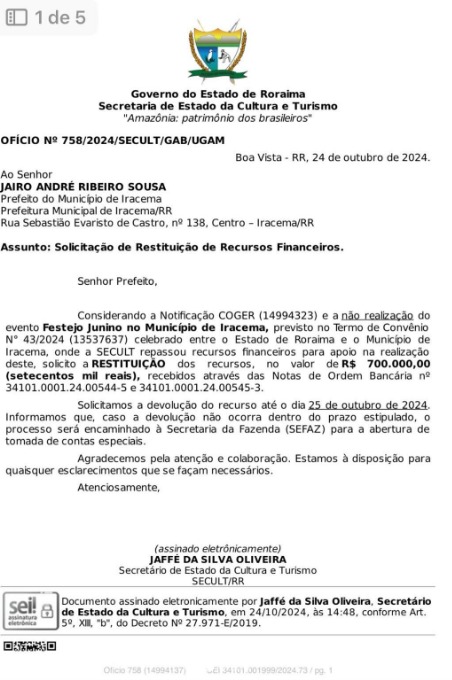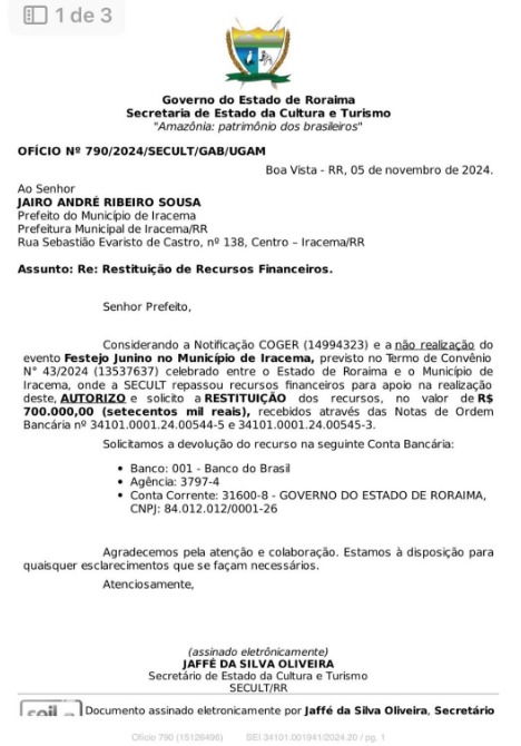 A prefeitura de Iracema, em Roraima, recebeu um repasse no valor de 700 mil reais para custear todas as despesas do Festejo Junino no município, porém o evento não foi realizado. O repasse foi feito por meio da Secretaria de Estado da Cultura e Turismo (Secult), que pede a restituição do valor.