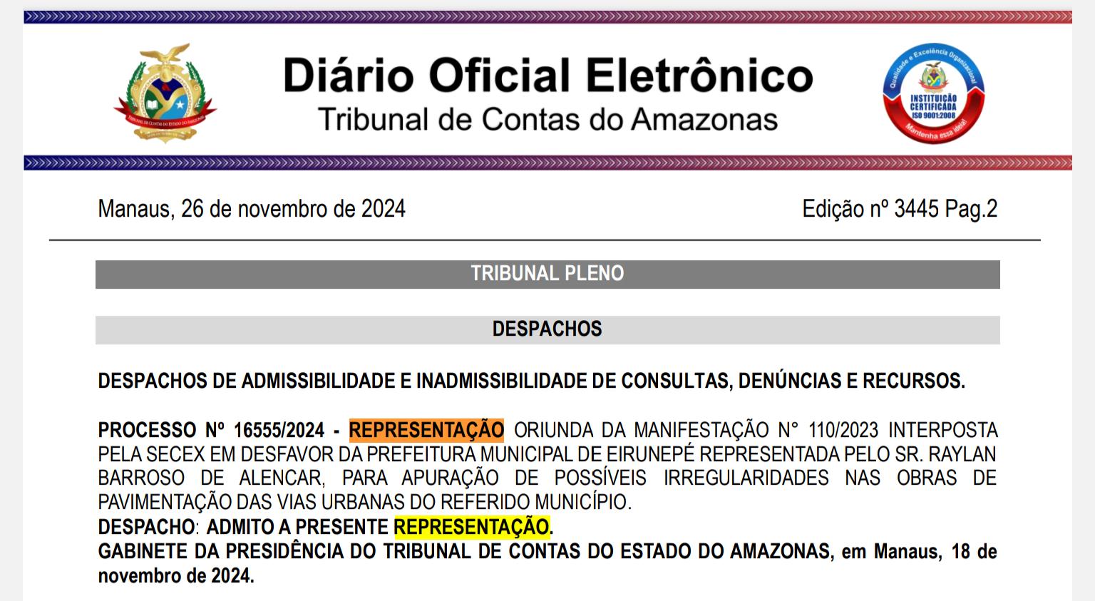Na tarde de terça-feira, 26, o Tribunal de Contas do Amazonas (TCE-AM) emitiu um despacho de admissibilidade, referente ao Processo nº 16555/2024, contra a Prefeitura de Eirunepé (a 1.159 quilômetros de Manaus) por possíveis irregularidades nas obras de pavimentação das vias urbanas do município.