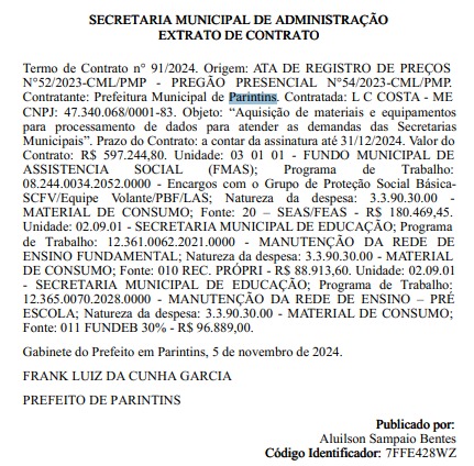 O primeiro contrato foi firmado com a empresa L C Costa – ME, que adquiriu materiais e equipamentos para processamento de dados e passa a valer a partir da data da assinatura até o dia 31 de dezembro de 2024. O valor do contrato é de R$597.244,80, que sai do Fundo Municipal de Assistência Social (FMAS).