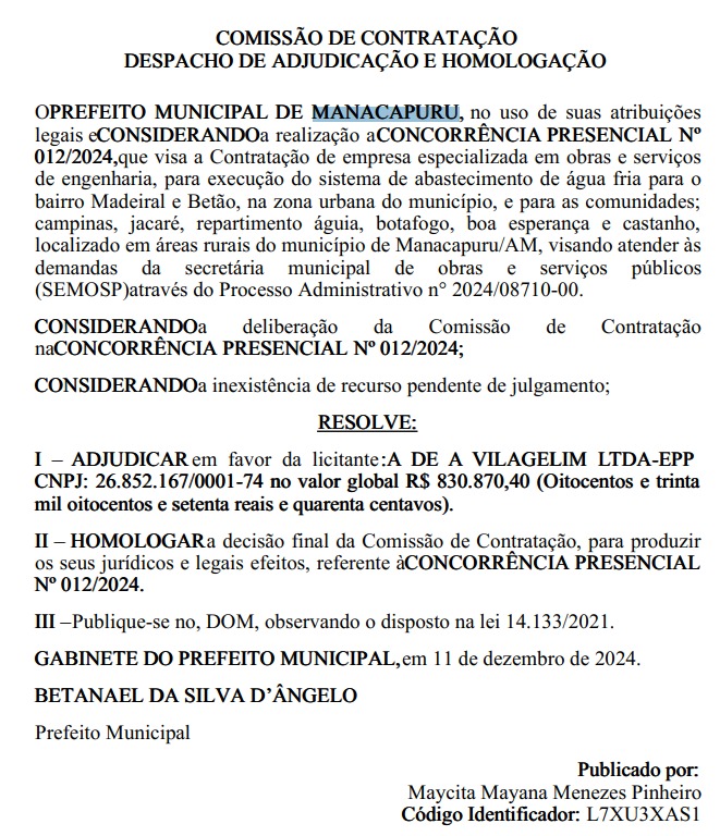 A empresa contratada é A De A Vilagelim LTDA, administrada por Alberto de Albuquerque Vilagelim, pelo valor de R$800.870,40 mil. A concorrência para a licitação foi feita de forma presencial. O documento foi assinado no dia 11, na última quarta-feira, e teve sua publicação na quinta-feira, 12.
