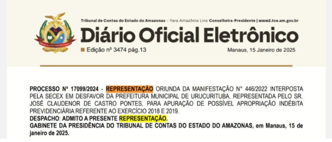 Na última quarta-feira, 15, o Tribunal de Contas do Amazonas (TCE-AM) publicou, por meio do Diário Oficial, o recurso em desfavor da Prefeitura de Urucurituba para apuração de possível apropriação indébita de recursos previdenciários referente ao período de 2018 e 2019. O município estava sob administração de José Claudenor Pontes, conhecido como Sabugo (PT).