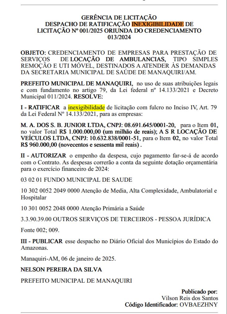 O prefeito de Manaquiri, Nelson Pereira da Silva (MDB), conhecido como Nelson Nilo, retirou do Fundo Municipal de Saúde o valor de R$1,960 milhão para a demanda de locação de veículos. O despacho foi assinado pelo prefeito no dia 6 de janeiro de 2025, sem necessidade de licitação.