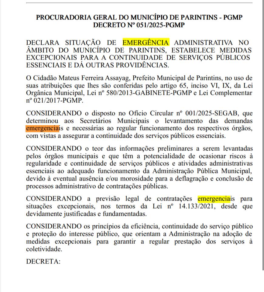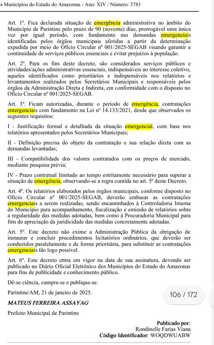 O prefeito de Parintins, Mateus Ferreira Assayag (PSD), decretou, por meio do Diário Oficial, situação de emergência administrativa no município. No documento, publicado na última quinta-feira, 23, consta que a medida é para dar continuidade nos serviços públicos essenciais e outras providências, visando “evitar prejuízos à população”. A vigência do decreto é de 90 dias a partir da publicação.