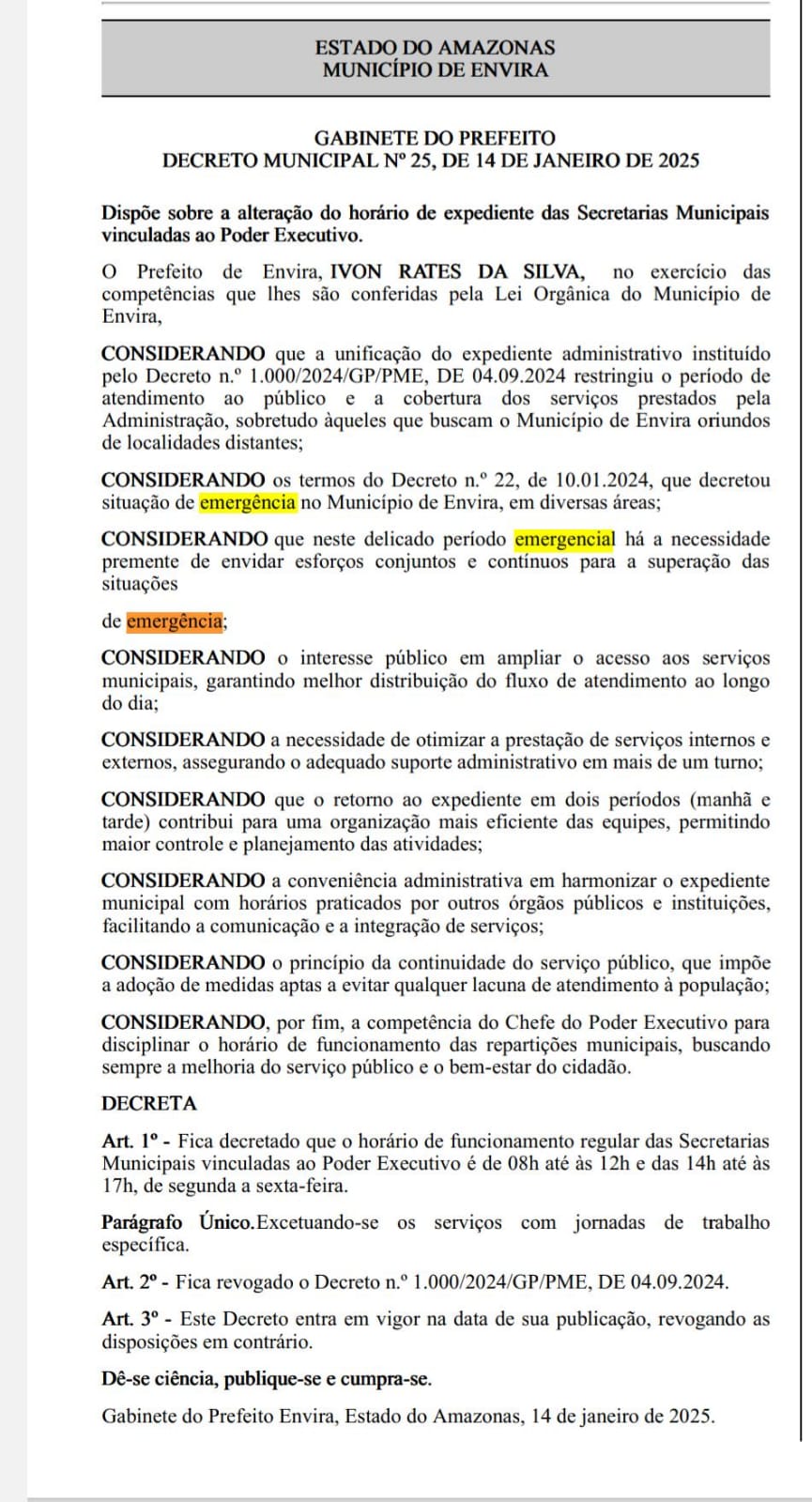 O prefeito eleito de Envira, Ivon Rates da Silva (PSD), decretou, por meio do Diário Oficial, situação de emergência no município. O decreto, assinado no dia 14 deste mês, prevê a otimização de serviços internos e externos, assegurando o adequado suporte administrativo em mais de um turno, o retorno do expediente em dois períodos, nos horários da manhã e da tarde, restringindo o período de atendimento ao público e consequentemente os horários dos serviços prestados.