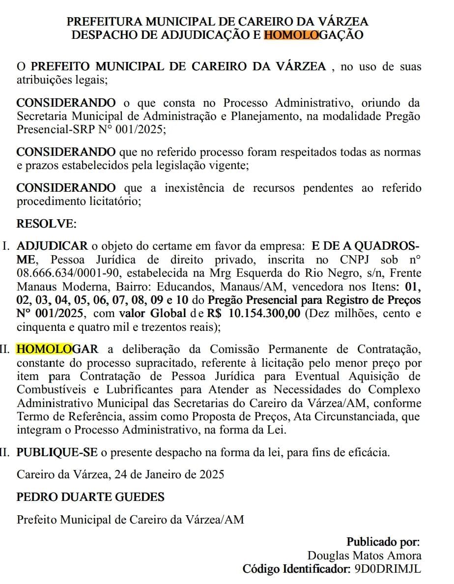 O prefeito de Careiro da Várzea (a 23 quilômetros de Manaus), Pedro Duarte Guedes (PSD), homologou um contrato que aumenta os gastos do município em 42%, apenas em combustíveis e lubrificantes. O contrato tem o valor de R$10,1 milhões.