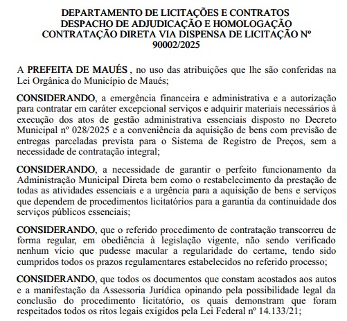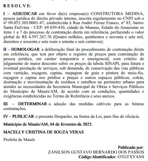 A prefeita de Maués (a 287 quilômetros de Manaus), Macelly Veras (PDT), no uso das suas atribuições, fez dispensa de licitação para contratação de uma construtora no valor de R$4,5 milhões em apenas um contrato com o município. O documento foi assinado no dia 4 de fevereiro e publicado nesta segunda-feira, 17, no Diário Oficial dos Municípios do Estado do Amazonas.