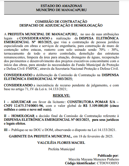 A prefeita de Manacapuru, Valciléia Flores Maciel (MDB), contratou uma empresa investigada pelo Ministério Público Federal (MPF) para prestar os serviços de construção de muro de contenção sobre estacas, reaterro e demolição de estruturas. O valor do contrato ficou em R$5.109 milhões e foi divulgado nesta quarta-feira, 19, no Diário Oficial dos Municípios do Estado do Amazonas.