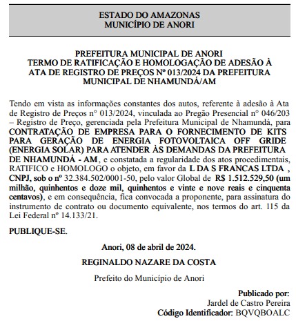 O prefeito de Anori (a 195 quilômetros de Manaus), Reginaldo Nazaré da Costa (Republicanos), publicou, no Diário Oficial dos Municípios do Amazonas, um termo de ratificação e homologação de adesão junto à Prefeitura de Nhamundá (a 333 quilômetros de Manaus). O objetivo é a contratação de uma empresa no modelo “carona”.
