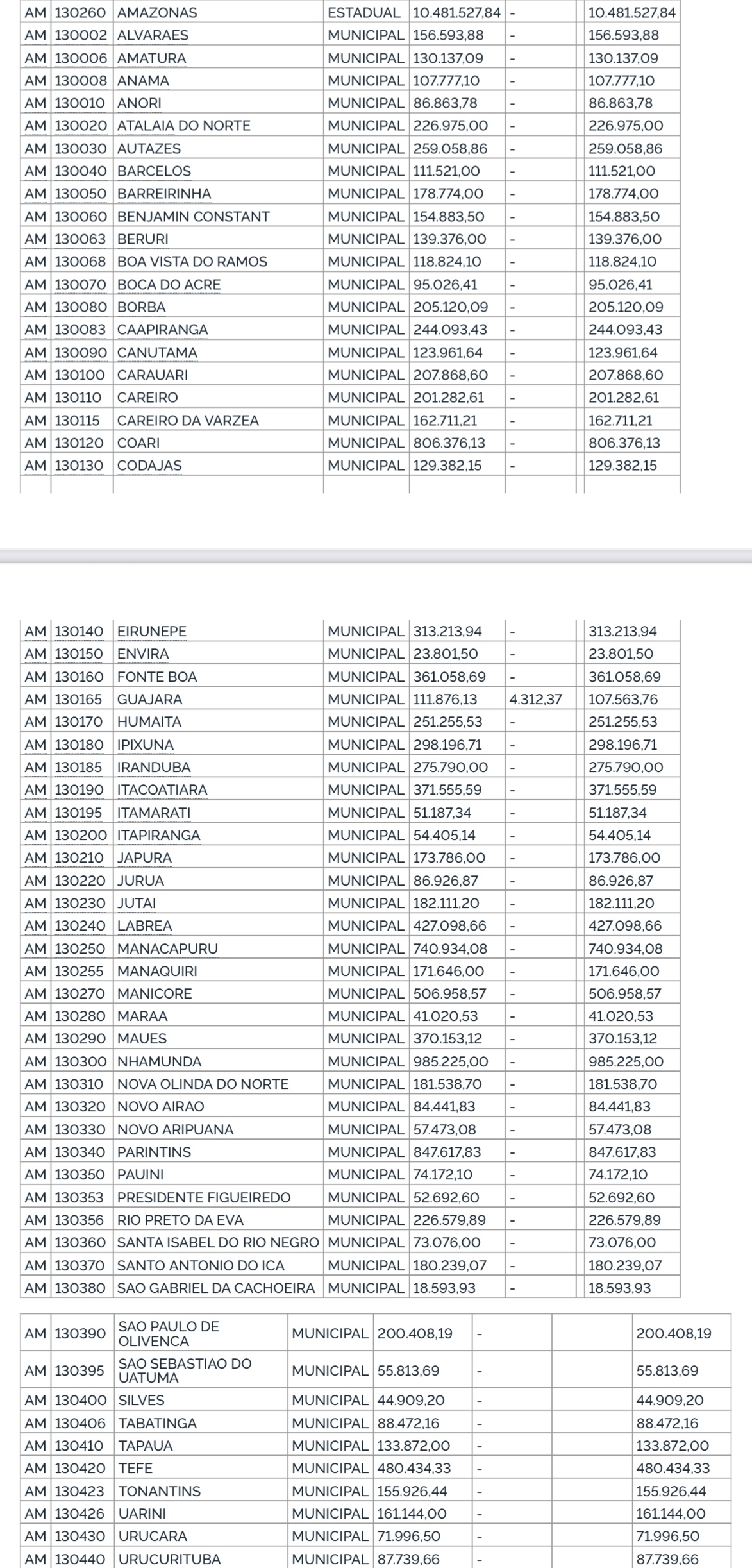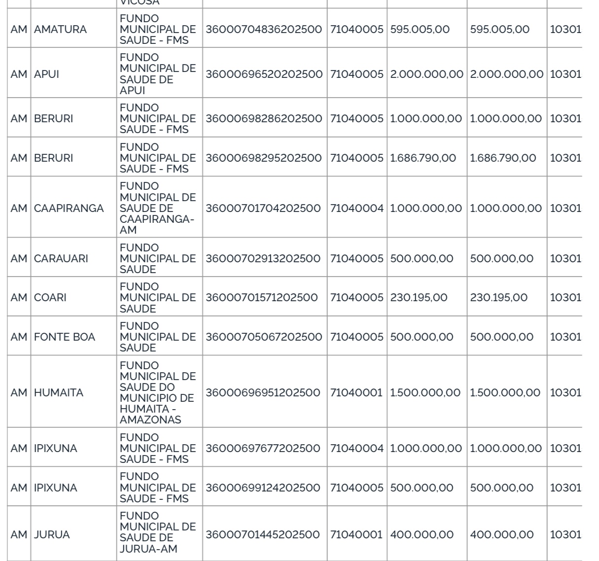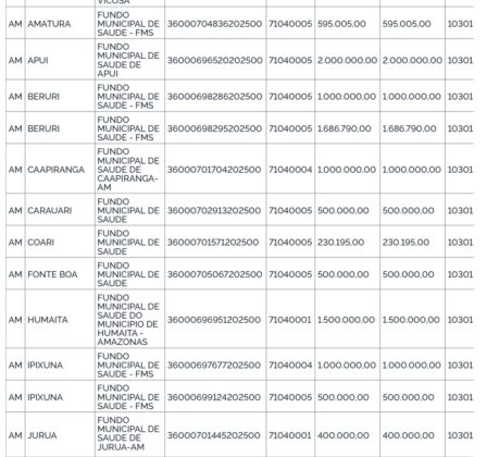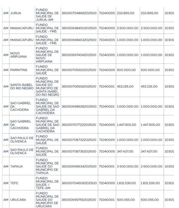 A primeira portaria foi publicada na segunda-feira, 22, e libera investimentos na ordem de R$ 10.481.527,84 referente ao mês de setembro, para reforçar a rede de saúde no estado. Apenas 59 municípios serão contemplados com o benefício, entre as cidades que receberão as maiores parcelas estão: Nhamundá com R$ 985.225,00; Parintins R$ 847.617,83; Coari R$ 806.376,13 e Manacapuru R$ 740.934,08.