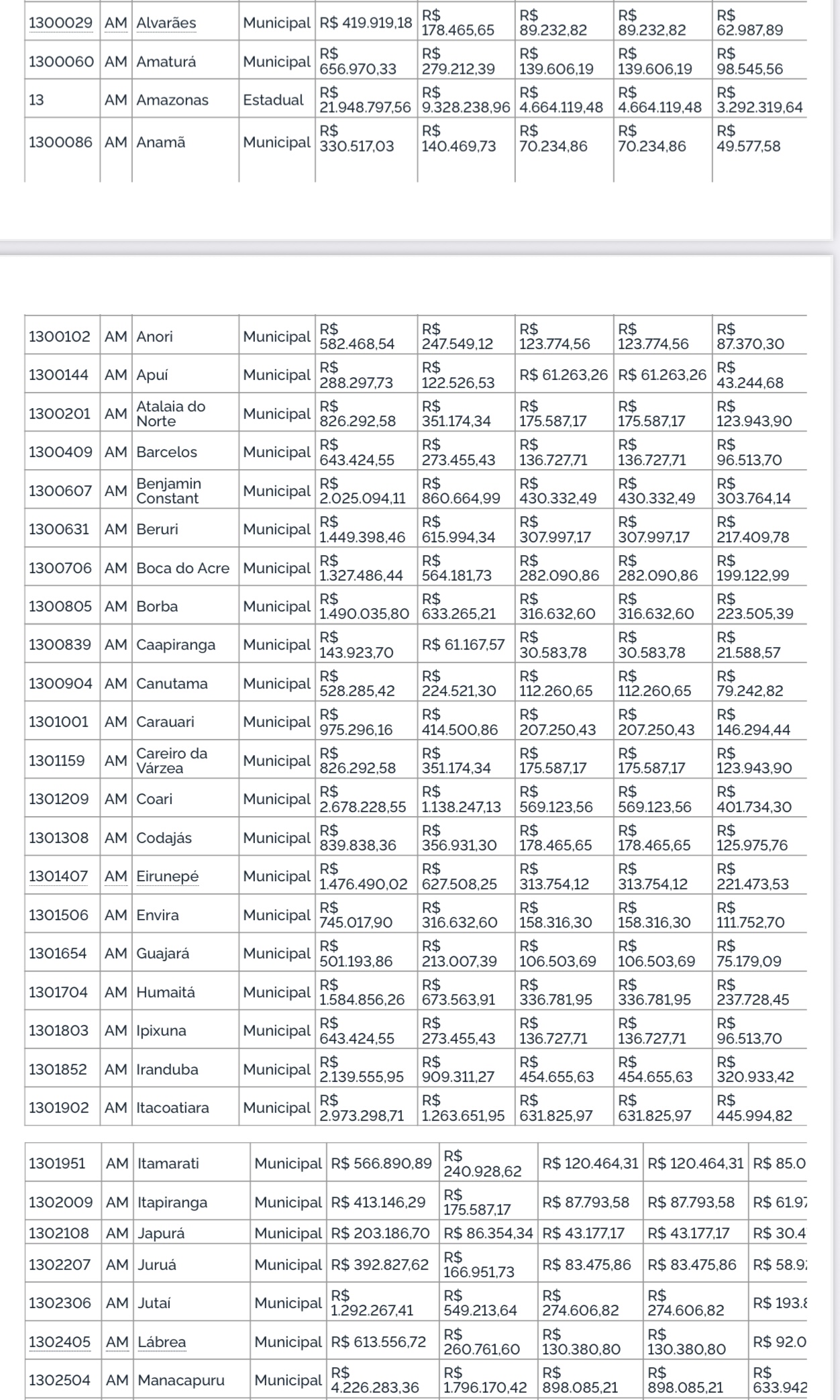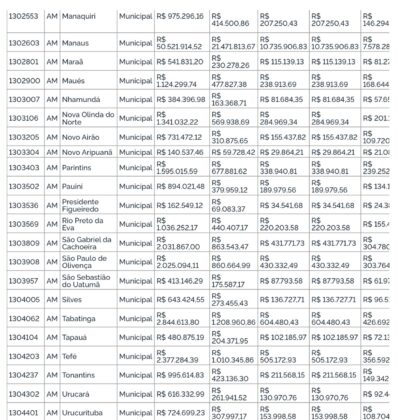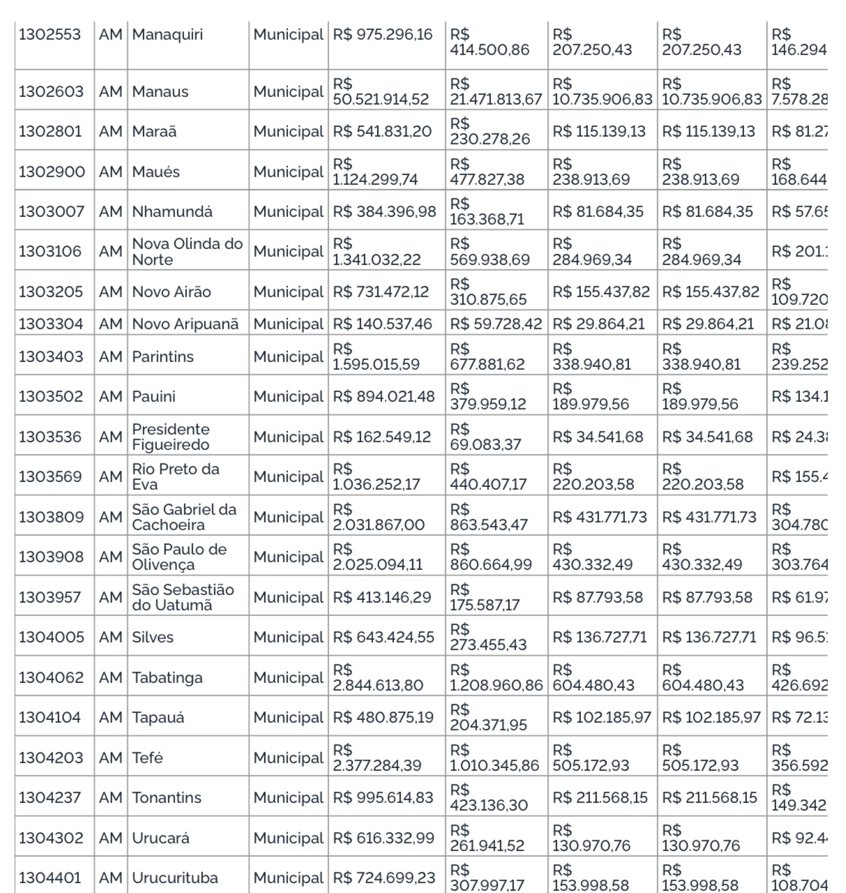 O valor total a ser repassado ao Amazonas será de R$ 21.948.797,56. Sendo distribuídos da seguinte forma: em outubro, R$ 9.328.238,96; Novembro R$ 4.664.119,48; Dezembro R$ 4.664.119,48; e Janeiro R$ 3.292.319,64.