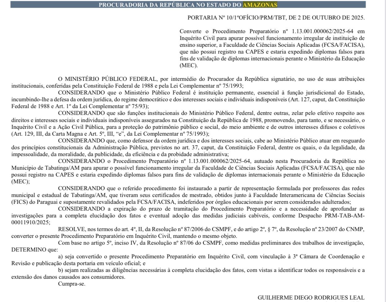 O Ministério Público Federal (MPF) instaurou um Inquérito Civil para investigar possíveis irregularidades na Faculdade de Ciências Sociais Aplicadas (FCSA/FACISA), localizada em Tabatinga, no Amazonas. A instituição de ensino não teria registro no CAPES e estaria emitindo diplomas falsos para fins de validação de certificados internacionais junto ao Ministério da Educação (MEC). A medida foi assinada pelo procurador da República, Guilherme Diego Rodrigues Leal.