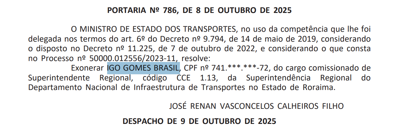 O superintendente do Departamento Nacional de Infraestrutura de Transportes de Roraima (Dnit-RR), Igo Gomes Brasil, foi exonerado do cargo. A decisão foi publicada por meio do Diário Oficial da União (DOU) na última sexta-feira, 10.