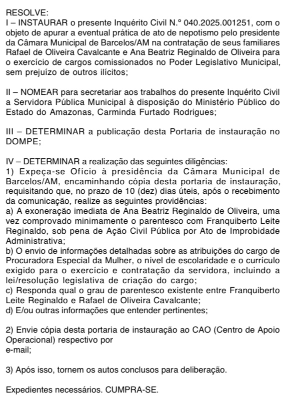 De acordo com o documento, a investigação teve origem em Notícia de Fato registrada em 12 de agosto de 2025, que apontou a nomeação de Rafael de Oliveira Cavalcante e Ana Beatriz Reginaldo de Oliveira para funções comissionadas na Câmara. Ambos seriam sobrinhos do presidente Franquiberto, e no caso de Ana Beatriz, filha do vereador Nilton José Braga de Oliveira.