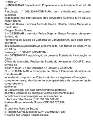 O Ministério Público do Estado do Amazonas (MPAM) instaurou um Procedimento Preparatório para investigar supostas irregularidades em nomeações e contratações de servidores municipais na Prefeitura de Canutama, que teriam parentesco com agentes públicos. A portaria foi publicada no Diário Oficial do órgão.