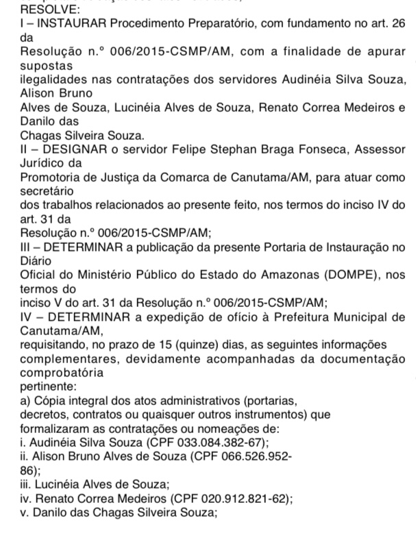 Assinado pela promotora de Justiça, Maria Cynara Rodrigues Cavalcante, o procedimento foi baseado em uma Notícia de Fato que denunciou a prática de nepotismo na prefeitura do município.  Entre os nomes citados estão Audinéia Silva Souza, Alison Bruno Alves de Souza, Lucinéia Alves de Souza, Renato Correa Medeiros e Danilo das Chagas Silveira Souza, que teriam sido nomeados para cargos comissionados ou contratados temporariamente, sem atender os princípios constitucionais da impessoalidade e moralidade administrativa.