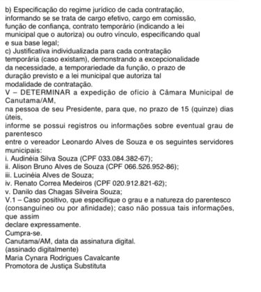 Outro ofício foi expedido à Câmara Municipal de Canutama, para que informe se há registro de parentesco entre o vereador Leonardo Alves de Souza e os servidores citados. Caso exista, o Legislativo deverá especificar o grau e a natureza do vínculo (consanguíneo ou por afinidade).