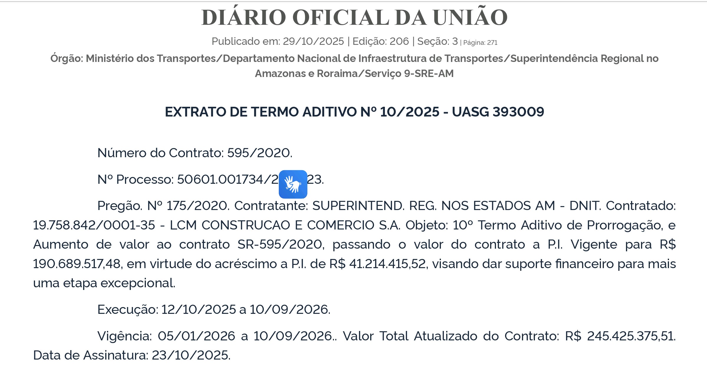 O 10º Termo Aditivo ao Contrato nº 595/2020, firmado entre o DNIT e a empresa LCM Construção e Comércio S.A., acrescenta R$ 41,2 milhões ao valor originalmente pactuado, elevando o total para R$ 245,4 milhões.