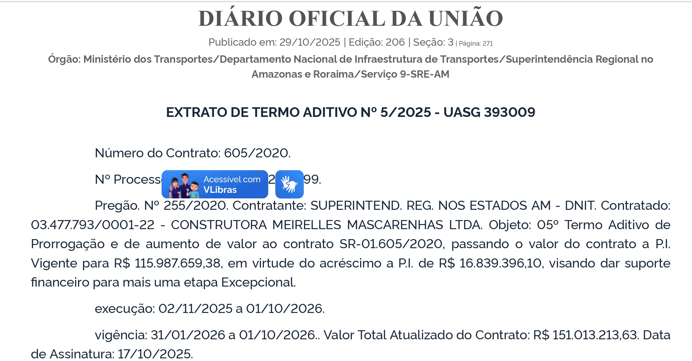 O Departamento Nacional de Infraestrutura de Transportes (DNIT) celebrou, em outubro de 2025, dois novos termos aditivos que ampliam significativamente os valores de contratos de manutenção e recuperação de rodovias federais no Amazonas. Somados, os acréscimos ultrapassam R$ 50 milhões.