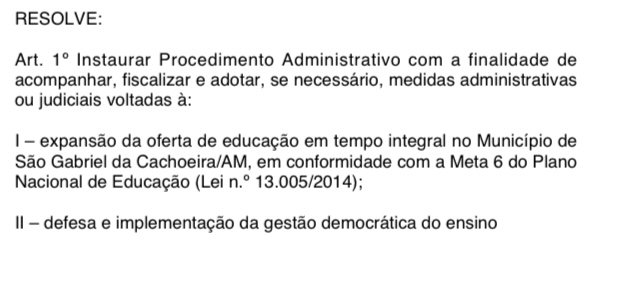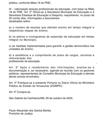 O Ministério Público do Estado do Amazonas (MPAM), instaurou um Procedimento Administrativo para acompanhar e fiscalizar políticas públicas na área da educação em São Gabriel da Cachoeira. A portaria foi assinada pelo promotor de Justiça, Paulo Alexander dos Santos Beriba, no último dia 29 de outubro.