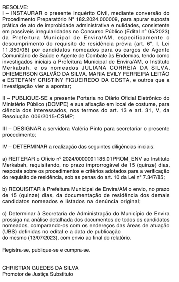 O Ministério Público do Estado do Amazonas (MPAM) instaurou um Inquérito Civil para investigar supostas irregularidades no Concurso Público realizado pela Prefeitura Municipal de Envira para os cargos de Agente Comunitário de Saúde (ACS) e Agente de Combate às Endemias (ACE), previstos no Edital nº 05/2023. A medida é assinada pelo promotor de Justiça substituto, Christian Guedes da Silva.