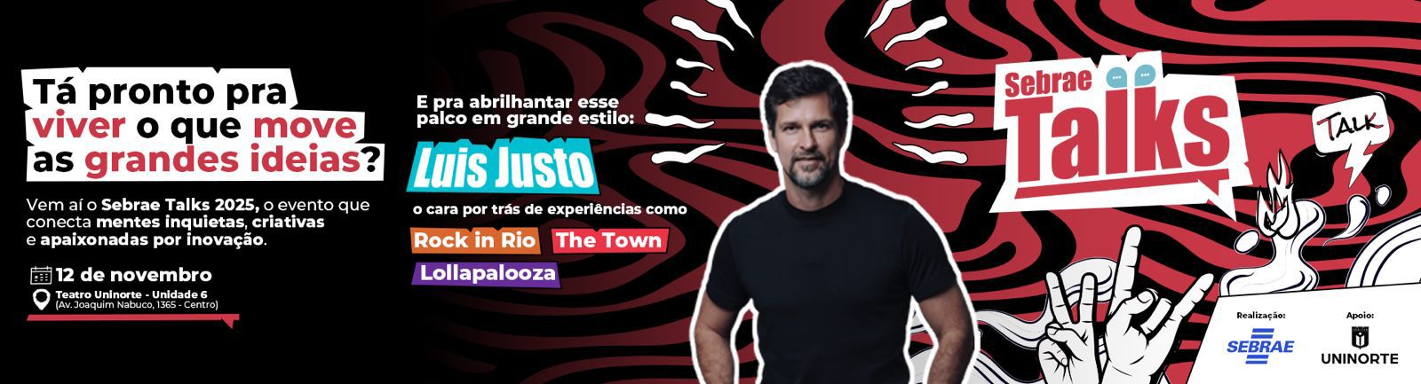 O Sebrae Talks chega à sua segunda edição no dia 12 de novembro, às 18h, no Teatro da Uninorte – Unidade 6 (Av. Joaquim Nabuco – Centro de Manaus). Com o objetivo de oferecer soluções práticas e inspiradoras para empreendedores locais, o evento contará com a presença de Luis Justo, CEO da Rock World, empresa responsável por festivais como Rock in Rio, Lollapalooza Brasil e The Town. As inscrições podem ser feitas pelo link: https://www.sympla.com.br/evento/sebrae-talks-2025-palestra-os-bastidores-do-rock/3196106 .