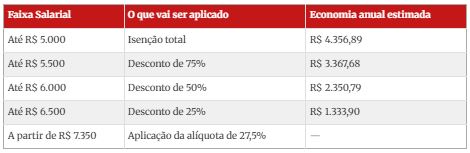 Para a faixa de renda superior a R$ 5 mil e inferior a R$ 7.350 mensais, estima-se que a pessoa física deve ser aliviada, considerando todo ano, de R$ 1.333,90 a R$ 3.367,68. As pessoas físicas com renda a partir de R$ 7.350 mensais vão continuar sujeitas à tributação pela alíquota de 27,5%.