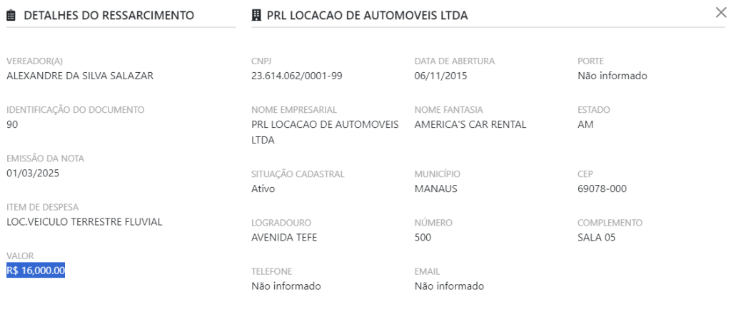 Além do vínculo com o assessor, os relatórios de despesas revelam que o gabinete de Salazar paga cerca de R$ 16 mil por mês à empresa PRL Locação de Automóveis LTDA, responsável pela locação de motocicletas. O detalhe que causa estranhamento é que o próprio vereador divulga a empresa em suas redes sociais, aparecendo em vídeos e publicações promovendo os serviços da locadora, como se fosse cliente ou parceiro.