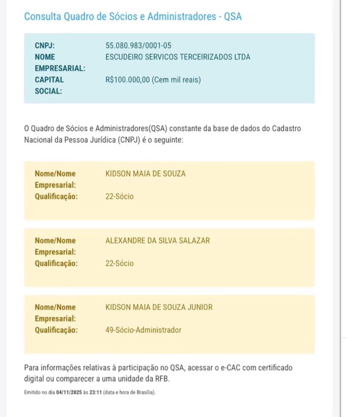 Os registros oficiais mostram que Kidson Maia de Souza Júnior, nomeado assessor parlamentar de Salazar, também é sócio do vereador na empresa Escudeiro Serviços Terceirizados LTDA, conforme dados da Receita Federal. O vínculo empresarial entre servidor e parlamentar levanta questionamento sobre os princípios básicos da moralidade e impessoalidade na administração pública.