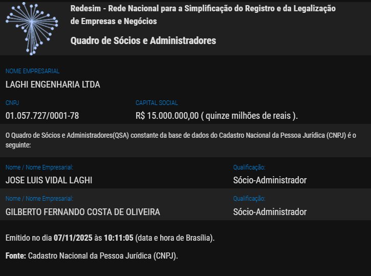A empresa possui um capital social de R$ 15 milhões e tem por sócios administradores os senhores, José Luis Vidal Laghi e Gilberto Fernando Costa de Oliveira. A Laghi tem por atividade a construção de edifícios.