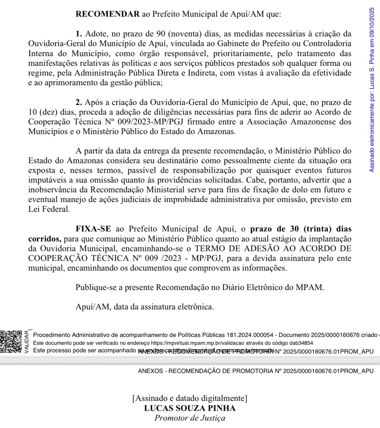 O Ministério Público do Estado do Amazonas (MPAM) expediu uma Recomendação ao prefeito de Apuí, Marquinhos Macil (MDB), para que crie a Ouvidoria Geral do Município em até 90 dias, vinculada ao Gabinete do Prefeito ou à Controladoria Interna. Ela deve funcionar como um canal de comunicação entre a população e a administração pública.