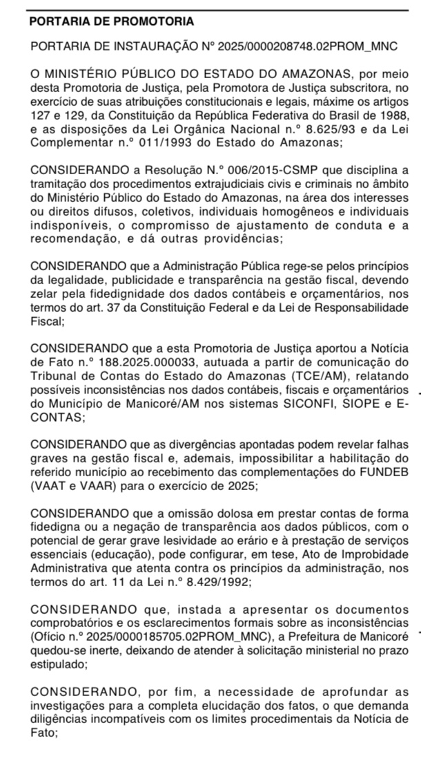 O Ministério Público do Amazonas (MPAM) instaurou um Procedimento Preparatório para investigar possíveis irregularidades na gestão fiscal do Município de Manicoré que está sob comando do prefeito Lúcio Flávio. A medida foi tomada após o Tribunal de Contas do Estado (TCE-AM) comunicar a existência de inconsistências nos dados contábeis, fiscais e orçamentários enviados pela Prefeitura aos sistemas oficiais SICONFI, SIOPE e E-CONTAS.
