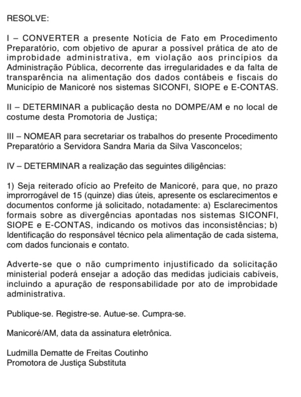 Com a conversão da Notícia de Fato em Procedimento Preparatório, o MPAM determinou novas diligências, incluindo a reiteração de ofício ao prefeito de Manicoré. Lúcio tem 15 dias úteis para apresentar explicações formais sobre as divergências apontadas, além de identificar os responsáveis técnicos pela alimentação de cada sistema, com dados funcionais e contato.