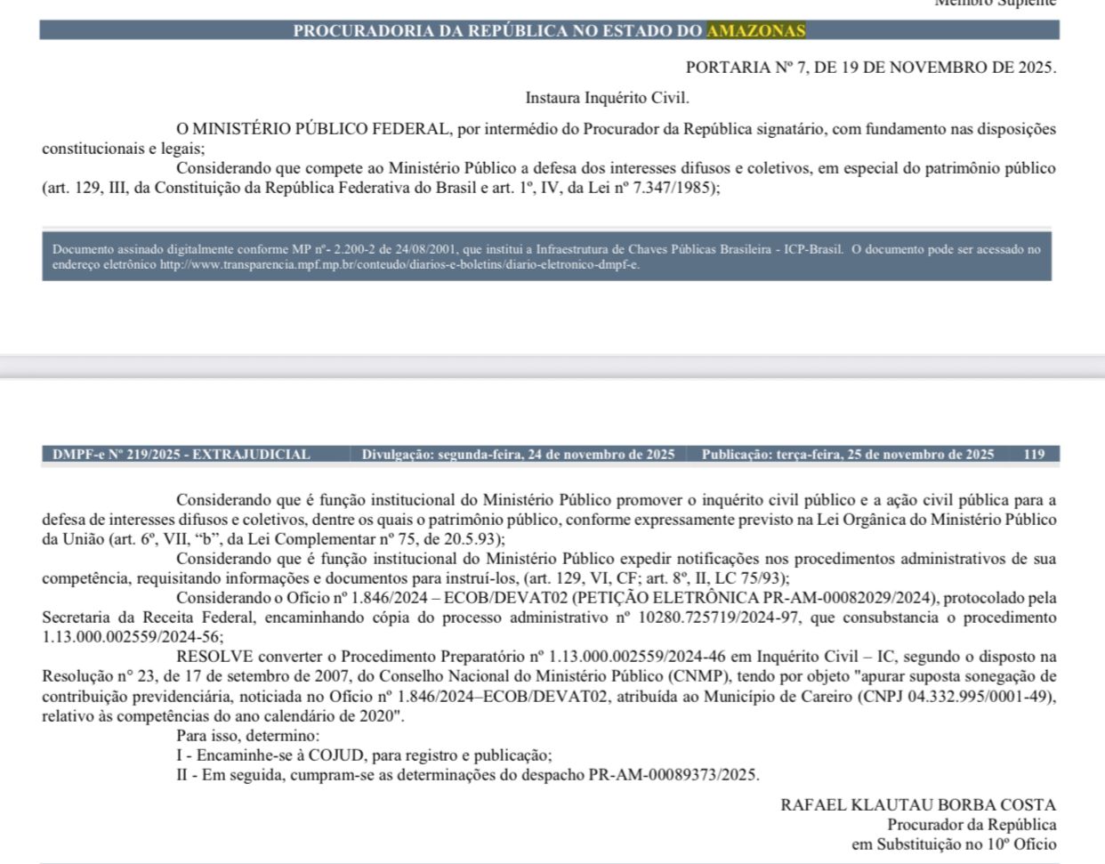 O Ministério Público Federal (MPF) no Amazonas instaurou um Inquérito Civil para investigar uma suposta sonegação de contribuições previdenciárias atribuída ao município de Careiro, que estava sob gestão de Nathan Macena. A apuração é relativa às competências do ano-calendário de 2020.
