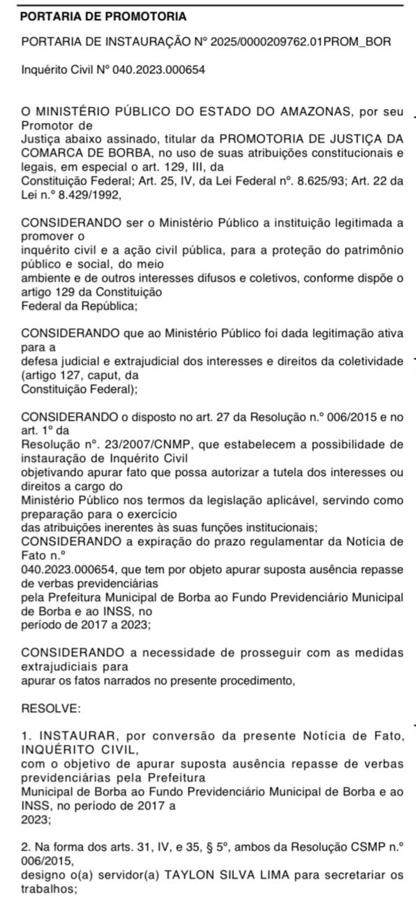 O Ministério Público do Estado do Amazonas (MPAM) instaurou um Inquérito Civil para investigar a suposta ausência de repasses de verbas previdenciárias por parte da Prefeitura Municipal de Borba ao Fundo Previdenciário Municipal e ao Instituto Nacional do Seguro Social (INSS) durante o período de 2017 a 2023.