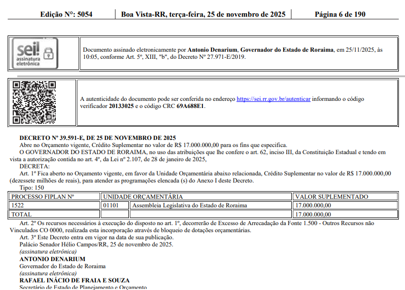 O governo de Roraima enviou crédito suplementar no valor de R$ 17 milhões para a Assembleia Legislativa de Roraima (ALE-RR). A informação consta no Diário Oficial do dia 25 de novembro.