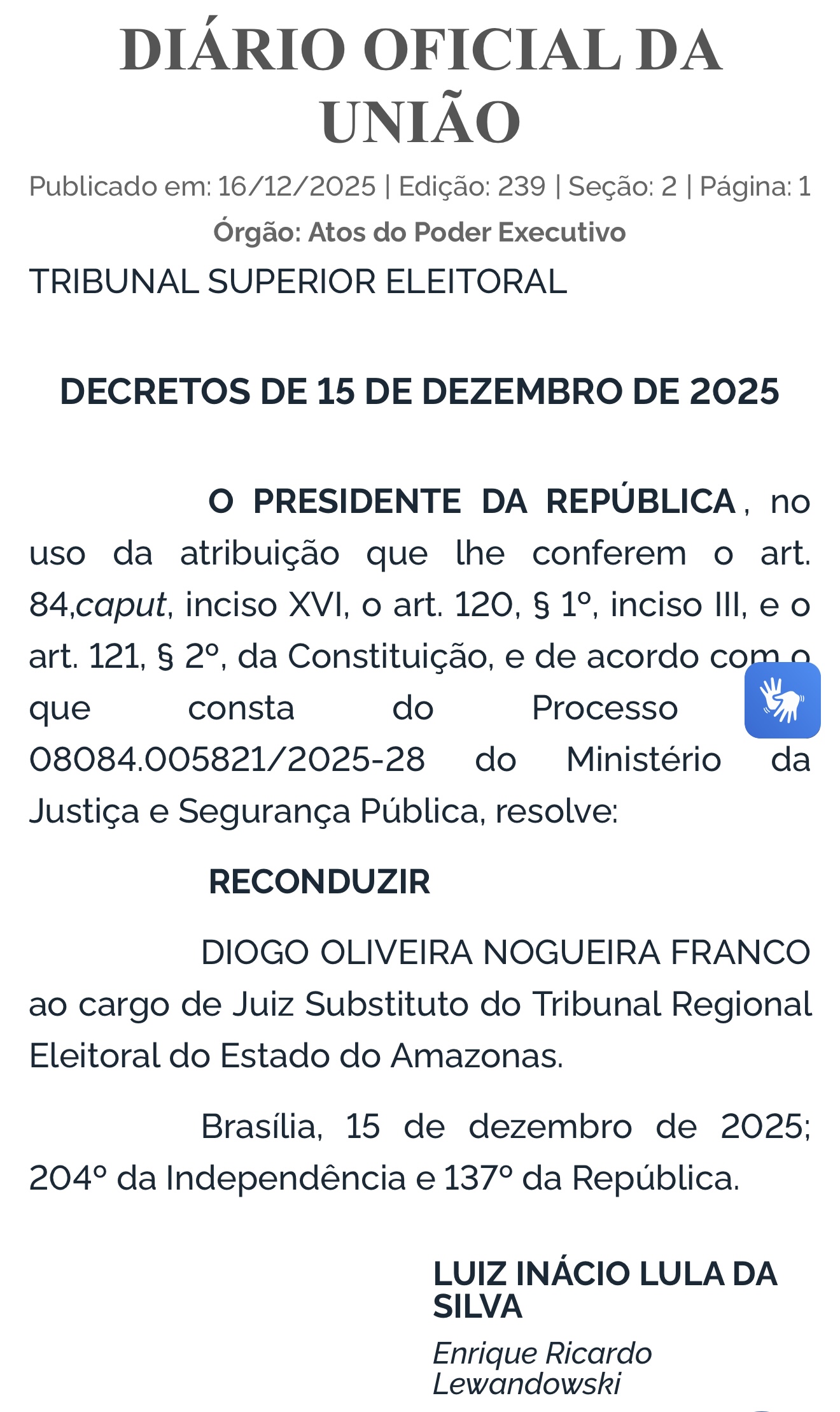 O presidente da República, Luiz Inácio Lula da Silva, assinou o decreto que reconduz Diogo Oliveira Nogueira Franco ao cargo de juiz substituto do Tribunal Regional Eleitoral do Amazonas (TRE-AM). A publicação consta no Diário Oficial da União desta terça-feira, 16.