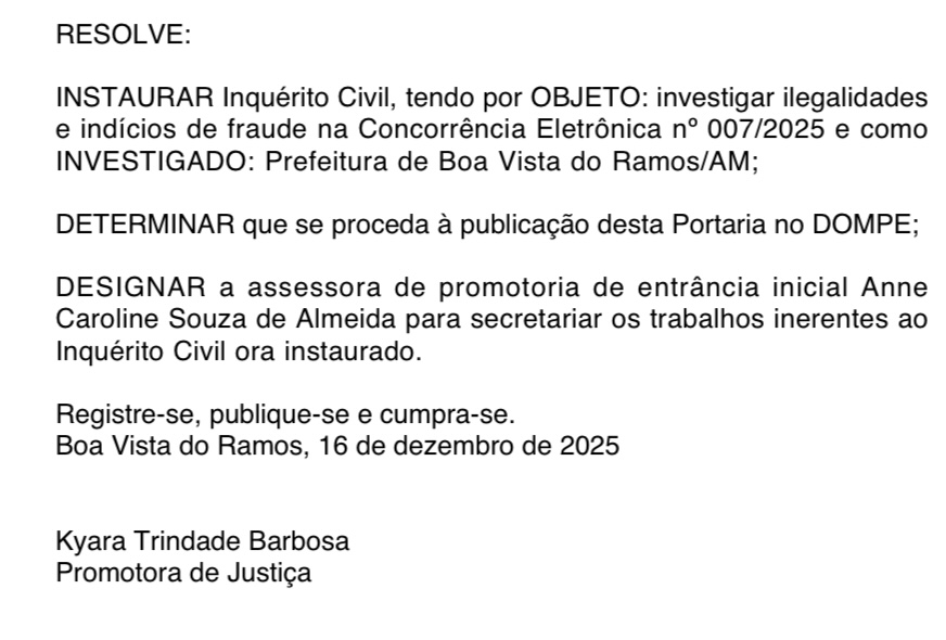 O Ministério Público do Estado do Amazonas (MPAM) instaurou Inquérito Civil para investigar possíveis ilegalidades e indícios de fraude na Concorrência Eletrônica nº 007/2025, realizada pela Prefeitura de Boa Vista do Ramos. Além disso, o órgão ministerial expediu recomendação formal para que o prefeito, Jarlem de Almeida Trindade, mais conhecido como ‘Jarlem CB’, anule o certame.