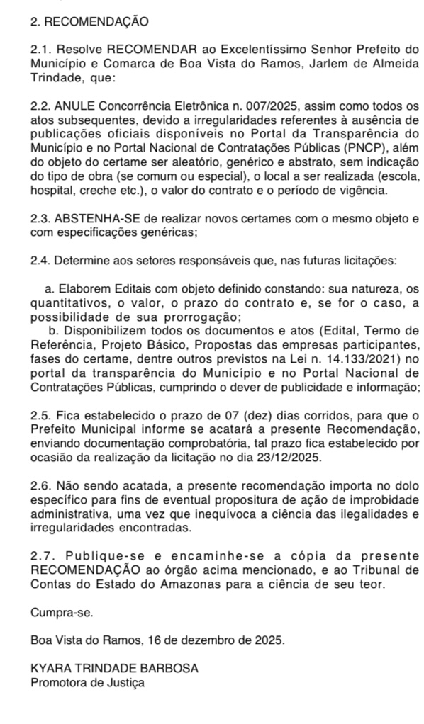 A promotora também expediu a Recomendação nº 2025/0000222795.01PROM_BVR, na qual orienta o prefeito a anular imediatamente a Concorrência Eletrônica nº 007/2025 e todos os atos dela decorrentes. O documento também recomenda que o município se abstenha de realizar novas licitações com objetos genéricos e que, em futuros certames, os editais tragam definição clara do objeto, quantitativos, valores, prazos contratuais e possibilidade de prorrogação, além da ampla divulgação de todos os documentos nos portais oficiais.