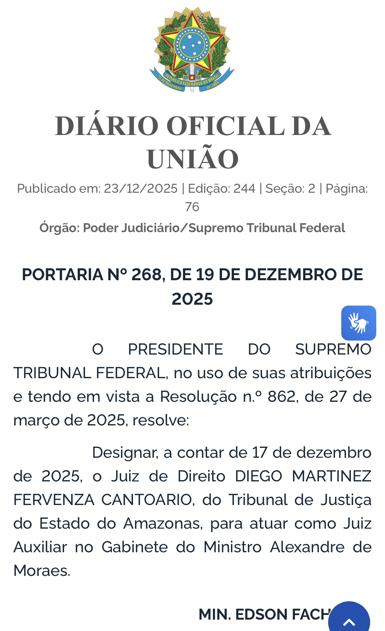 O presidente do Supremo Tribunal Federal (STF), ministro Edson Fachin, designou o juiz de Direito, Diego Martinez Fervenza Cantoario, do Tribunal de Justiça do Estado do Amazonas (TJAM), para atuar como juiz auxiliar no gabinete do ministro Alexandre de Moraes. A designação consta na Portaria nº 268/2025 publicada no Diário Oficial da União desta terça-feira, 23.