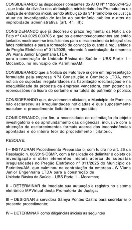 O Ministério Público do Estado do Amazonas (MPAM) instaurou um Procedimento Preparatório para apurar possíveis irregularidades no Pregão Eletrônico nº 011/2025, realizado pelo Prefeitura de Parintins, que resultou na contratação da empresa JW Viana Junior Engenharia LTDA para a construção da Unidade Básica de Saúde (UBS) Porte II – Mocambo.
