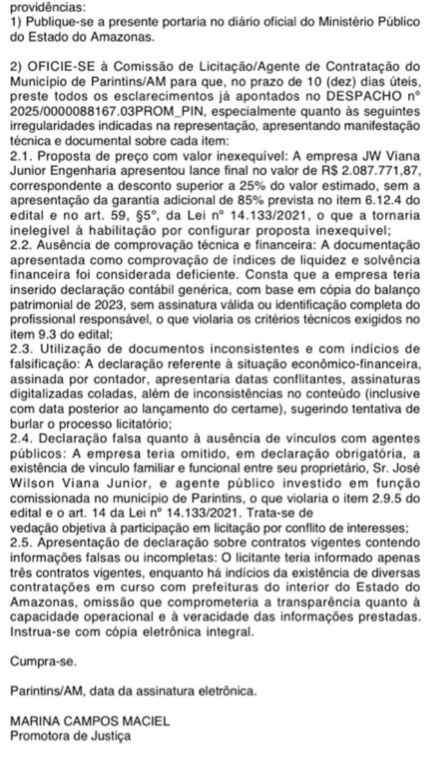 A promotora de Justiça, Marina Campos Maciel, que assina a portaria, determinou que a Comissão de Licitação do Município de Parintins preste esclarecimentos técnicos e apresente documentação completa no prazo de 10 dias úteis, detalhando cada um dos questionamentos apontados.