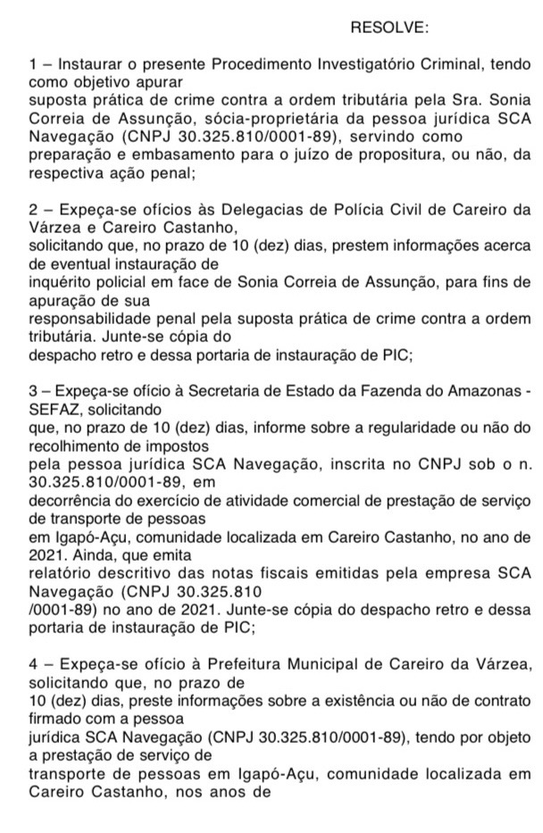 O Ministério Público do Estado do Amazonas (MPAM) instaurou Procedimento Investigatório Criminal (PIC) para apurar a suposta prática de crime contra a ordem tributária envolvendo a empresa SCA Navegação, que teria prestado serviços de transporte de pessoas sem emissão de notas fiscais na comunidade de Igapó-Açu, localizada em Careiro Castanho.